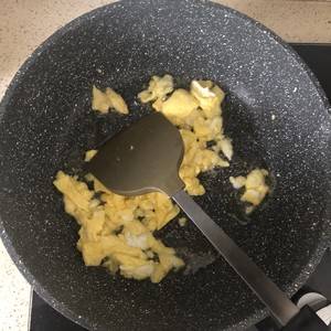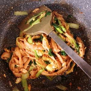 5、放入牛筋面和鸡蛋,倒入调好的调料汁翻炒。最后放上余下的蒜末,喷点儿醋汁即可出锅。