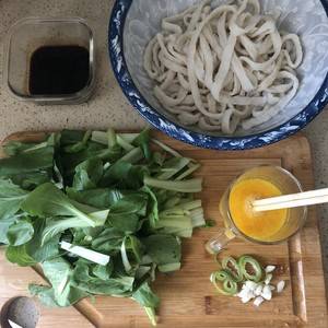 1、牛筋面泡好,油菜洗好切段,葱姜蒜切碎,鸡蛋打散,生抽、老抽、五香粉、糖混合。