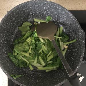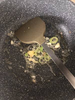 3、用锅里余油爆香葱姜蒜。蒜不要都放进去,留一部分最后出锅用。