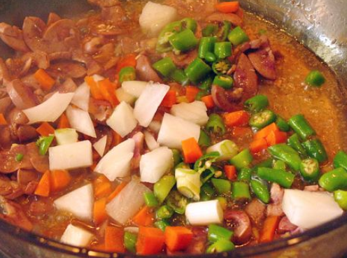 再把洋葱,辣椒,胡萝卜丁,倒入,翻炒,炒些蚝油,少许白糖,盐,翻炒一下。