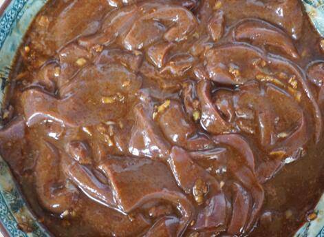 在切片的猪肝内依次倒入料酒、老抽、橄榄油、白砂糖、生粉,调味后的猪肝腌制5分钟。