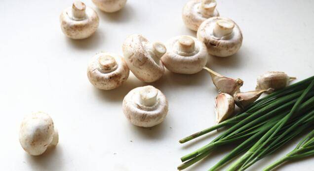 1、准备材料:蘑菇300克、韭菜50克、蒜3颗、花生油15毫升、蚝油10克。