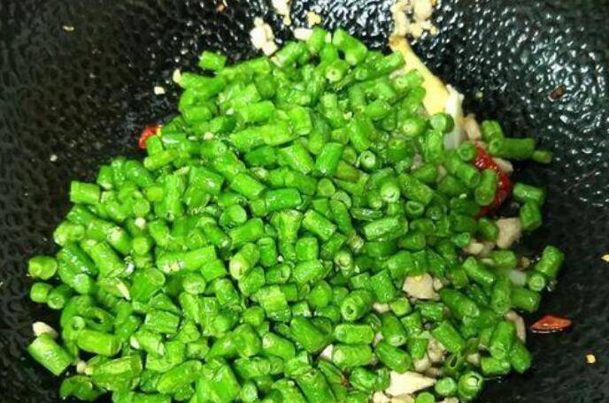 2、锅内放入稍微多一些的油,油温至六成热放入豆角和青椒圈炸至表皮起泡微皱,捞出控油备用。