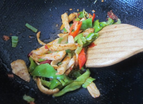 鸡脯肉切宽条,尖椒、胡萝卜切宽条,葱姜切片,蘑菇挤干水分;