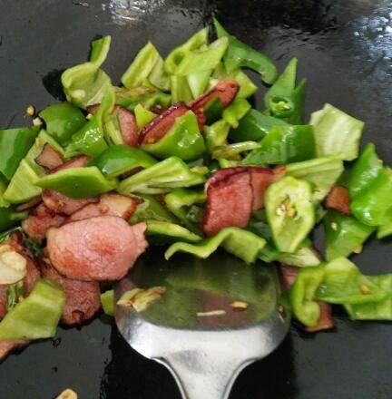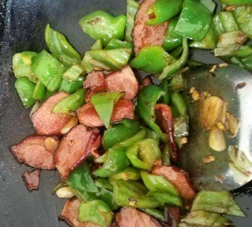 青椒250克、腊肉250克、蒜两瓣、葱三小段、食盐2克、生抽1勺、蚝油1勺。