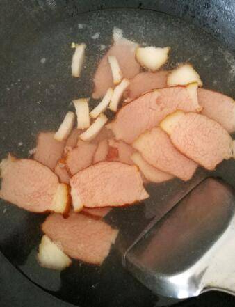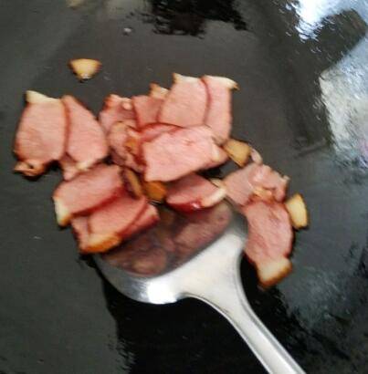 2、放入一点油,将腊肉煸炒,先下入肥的后下入瘦的。