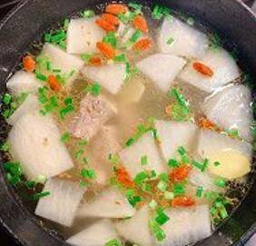1、准备食材:白萝卜、肋排、枸杞、香葱、姜片、食盐、白胡椒粉。