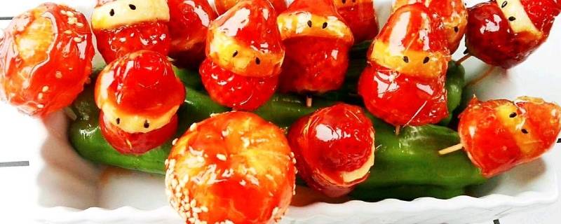 香蕉切段,取一个竹签插入一块草莓,再插入一个香蕉,草莓的头部插上。