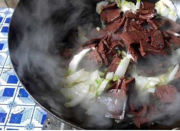 带白菜七成热时,加入事先炒好的血片;