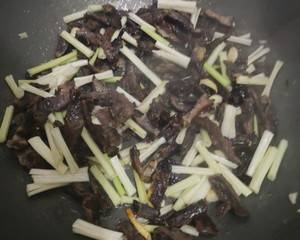 2、姜蒜切碎,芹菜切段,热油下姜蒜,爆香后加入牛肉干。