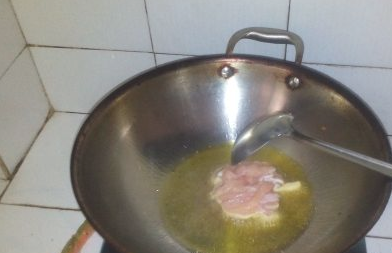 锅中入油,油热后下入鸡肉;