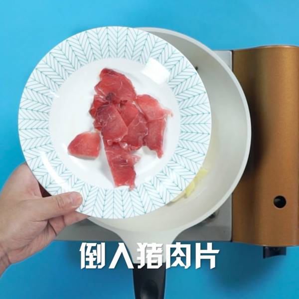 3、倒入猪肉片,翻炒至变色。
