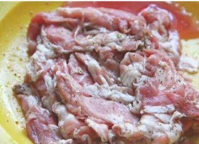 取200克羊羔肉片,室温解冻,用流动水冲去血水,加2毫升料酒,盐少许,花椒粉一小勺腌制。