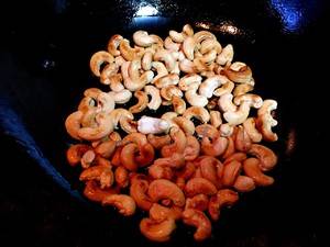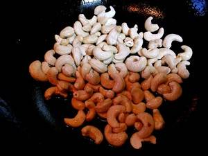 4、炒制期间一定要用小火,不停翻炒,直到腰果表面颜色变成金黄色为止,关火。捞出沥干油,冷却。