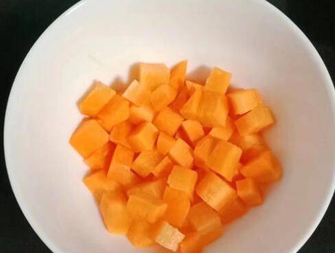 7、锅中热油,下蒜末爆香,倒入玉米粒和胡萝卜丁翻炒。