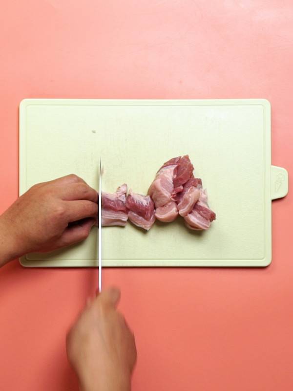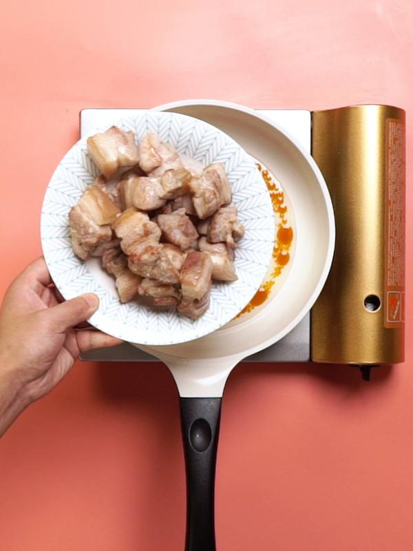 2、锅中放油,油温烧至五成热,放入五花肉,中小火煎至七成熟。