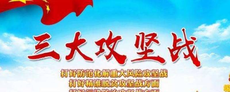 三大攻坚战是防范化解重大风险、精准脱贫、污染防治。习近平总书记在十九大报告中提出:要坚决打好防范化解重大风险、精准脱贫、污染防治的攻坚战,使全面建成小康社会得到人民认可、经得起历史检验。十三届全国人大一次会议审议的政府工作报告将三大攻坚战作战图和盘托出:推动重大风险防范化解取得明显进展、加大精准脱贫力度、推进污染防治取得更大成效。