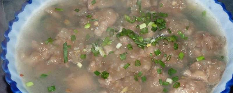4、肉片加入芡粉,倒入刚沸腾的开水,用筷子使劲搅拌均匀。