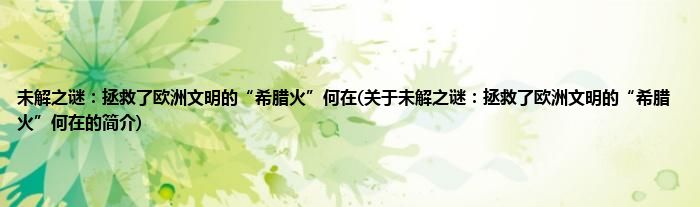 大家好,未解之谜:拯救了欧洲文明的“希腊火”何在,关于未解之谜:拯救了欧洲文明的“希腊火”何在的简介很多人还不知道,现在让我们一起来看看吧!